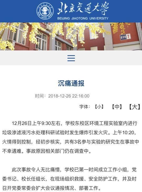 據(jù)北京交通大學(xué)12月26日通報(bào),當(dāng)日上午9時(shí)30分左右,該校東校區(qū)環(huán)境工程實(shí)驗(yàn)室內(nèi)進(jìn)行垃圾滲濾液污水處理科研試驗(yàn)時(shí)發(fā)生爆炸引發(fā)火災(zāi)。3名參與實(shí)驗(yàn)的研究生不幸遇難。
