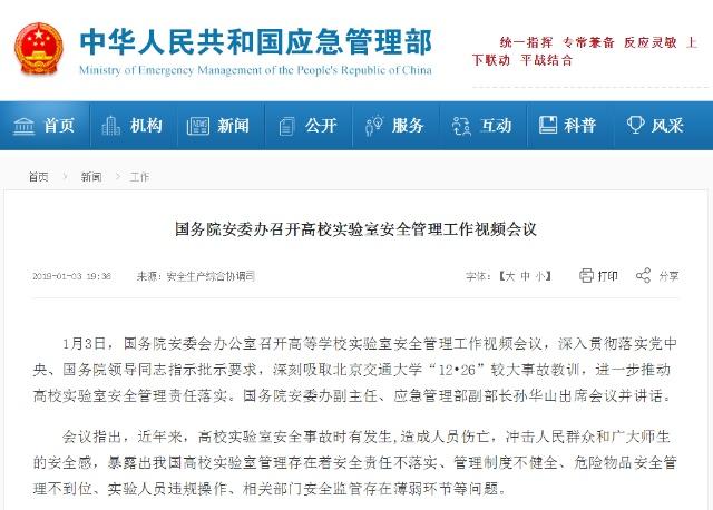 1月3日,國務(wù)院安委會(huì)辦公室召開高等學(xué)校實(shí)驗(yàn)室安全管理工作視頻會(huì)議,深入貫徹落實(shí)黨中央、國務(wù)院領(lǐng)導(dǎo)同志指示批示要求,深刻吸取北京交通大學(xué)“1226”較大事故教訓(xùn),進(jìn)一步推動(dòng)高校實(shí)驗(yàn)室安全管理責(zé)任落實(shí)。國務(wù)院安委辦副主任、應(yīng)急管理部副部長孫華山出席會(huì)議并講話。