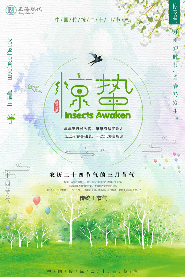 此前,昆蟲入冬藏伏土中,不飲不食,稱為“蟄”;到了“驚蟄節(jié)”,天上的春雷驚醒蟄居的動物,稱為“驚”。故驚蟄時,蟄蟲驚醒,天氣轉(zhuǎn)暖,漸有春雷,中國大部分地區(qū)進入春耕季節(jié)。古代分驚蟄為三候:“一候桃始華;二候倉庚(黃鸝)鳴;三候鷹化為鳩?!斌@蟄三候所代表的花信為:“一候桃花,二候杏花,三候薔薇?!?。